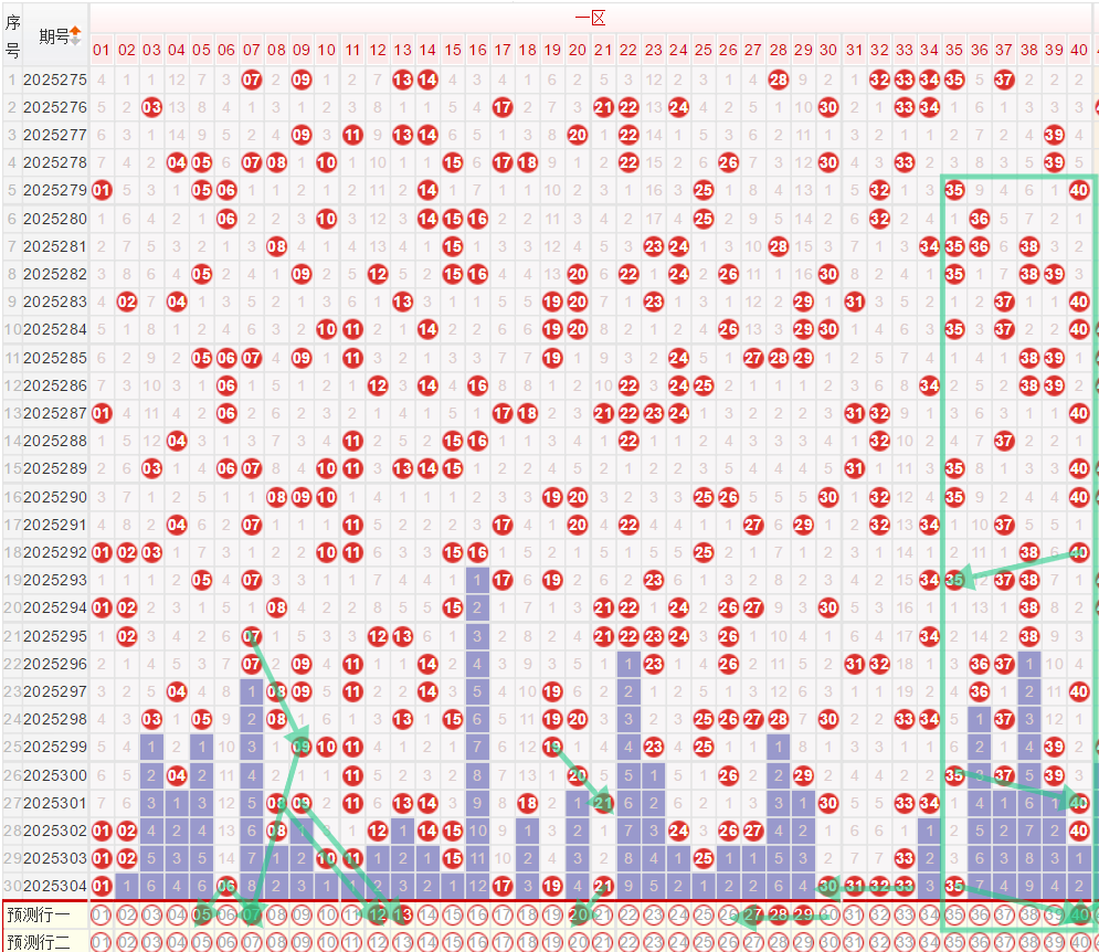 如图所示:在本期小数区的选号中,注意在上期的走势中一区间开出了4枚中奖号码,落位在区间的最低位,在连续多期的均值走势之后上期一区间落号数量出现了下滑走势,在其尾部出现了17 19 21的奇数三连号走势,本期注意一区间的落号数量继续保持在低位走势,在上期冷号回补中开出了06 17的双码走势,本期注意在06 17的下方考虑延续走势,以及中段号码中注意均线延续走势的12 13,在上期开出17 19 21的位置注意整体可能出现向后延续的走势,二区间上期开出了6枚中奖号码,落号形态非常的密集30 31 32 33 35的假六连走势,包含了四连号的形态,本期注意在21至30中间段的回补走势,落号形态建议优先考虑连号走势,在上期开出35之后,本期注意35的重号走势,或者是35 40的交替走势。