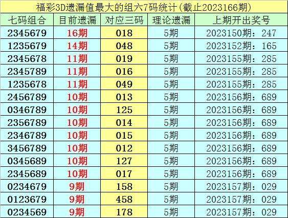1。截止第23166期,七码组六遗漏最大的是:2345679,当前遗漏16期。