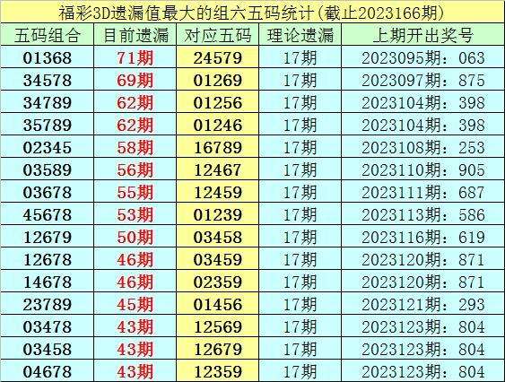 1。截止第23166期,五码组六遗漏最大的是:01368,当前遗漏71期。