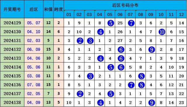 上期后区开出号码04 09,和值13,近十期和值 12 14 5 15 10 11 11 15 7 13,和值波动范围较大,本期预测和值会下降,重点关注号码:03 08,和值11。