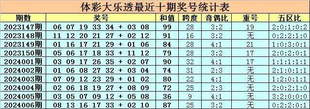 上期开奖:大乐透第2024006期奖号为:08 13 16 17 33 + 02 10,前区号码和值为87,跨度为25,奇偶比为3:2,无重号,五区比为0:2:2:0:1。