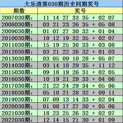 1、历史上大乐透第030期开出了16次,从2007年-2022年;