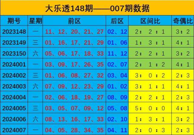 大乐透第2024007期出奖号统计:前区04 05 28 34 35,后区04、11,和值为106,跨度31,龙头04凤尾35,三区比为2:0:3,012路比为0:3:2,奇偶比为2:3,大小比为3:2,冷热比为4:1,0枚重号,2组连号。