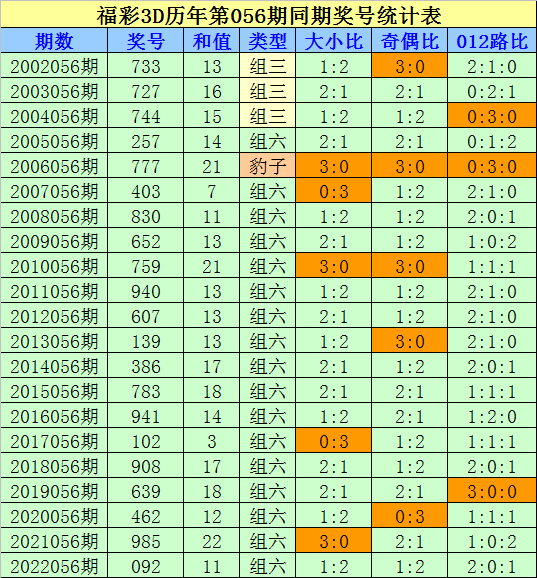 组选类型判断:在第056期历史同期开奖中,组六开出17次,组三开出3次,豹子开出1次,今年同期看好开出组六号码。