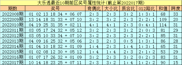 开奖回顾:体彩大乐透第22017期开出奖号为:10 14 18 23 25+07 11,前区012路比为1:2:2,质合比为1:4,奇偶比为2:3,大小比为3:2,后区012路比为0:1:1,质合比为2:0,奇偶比为2:0,大小比为2:0。