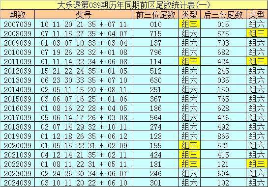 在大乐透第039期历年同期奖号中,前区后三位尾数出号频次分别为:尾数5出现10个,尾数2出现8个,尾数1、4出现7个,尾数0、6出现6个,尾数7出现4个,尾数8出现3个,尾数3出现2个,尾数9出现1个。其中尾数数字三类型豹子、组三、组六次数比为0:3:15,今年同期后三位尾数类型参考组六;