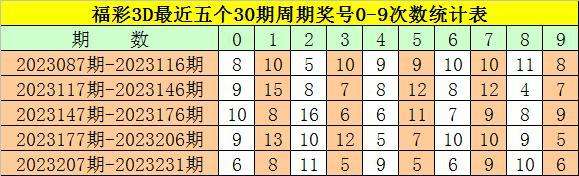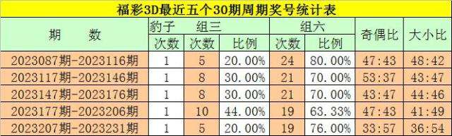 在最近一个30期周期内(第2023207期-第2023236期),组三(含豹子)号码共出现6期,占开奖总数的24%,组六奖号共出现19期,开出比例为76%,上期出现组六号码之后,本期看好组六号码继续开出。