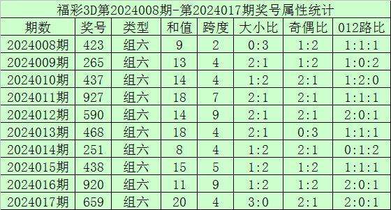 开奖回顾:福彩3D第2024017期开奖号:659,其中奖号和值:20,奇偶比2:1,大小比3:0。