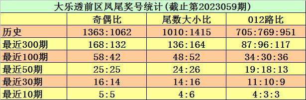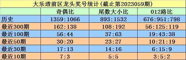 龙头号码012路比为3:5:2,奇偶比为7:3,尾数大小比为5:5。