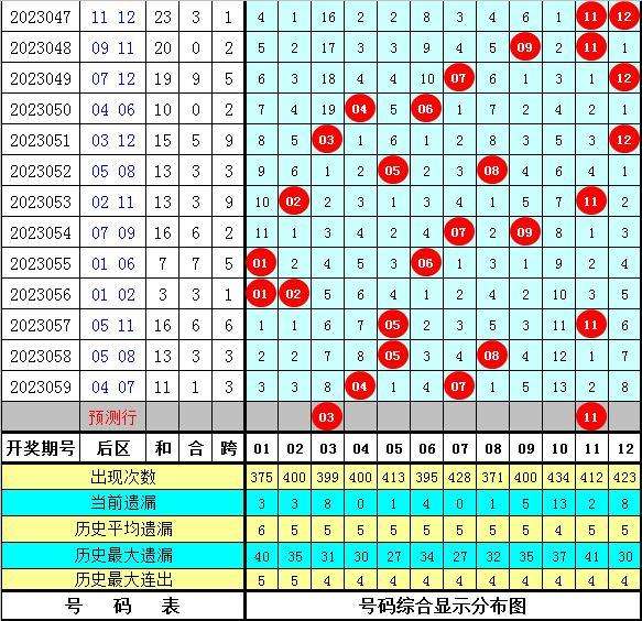 本期预计后区和值在14附近开出,后区参考号码:02、03、04、09、11。