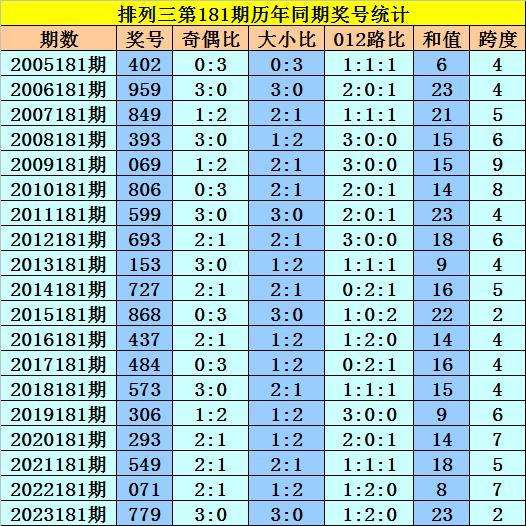开奖回顾:排列三第2024180期开出奖号215,奖号012路比为0:1:2,大小比为1:2,奇偶比为2:1,最近三年第181期同期开出奖号为:第2021181期:549、第2022181期:071、第2023181期:779。