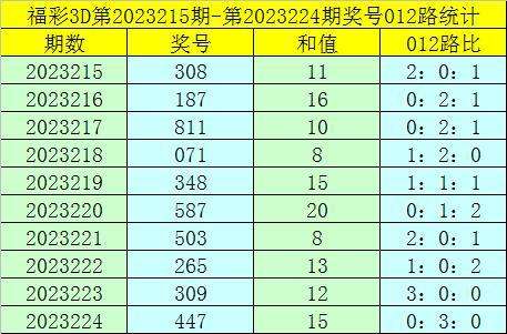 上期回顾:福彩3D第2023224期开出奖号:447。奖号为组三形态,与试机号没有同,奇偶比为1:2,大小比为1:2,012路比为0:3:0,和值为15,跨度为3。