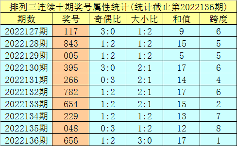上期回顾:排列三第2022136期奖号:656。类型:组三,奇偶形态:偶奇偶,大小形态:大大大,和值:17,跨度:1。