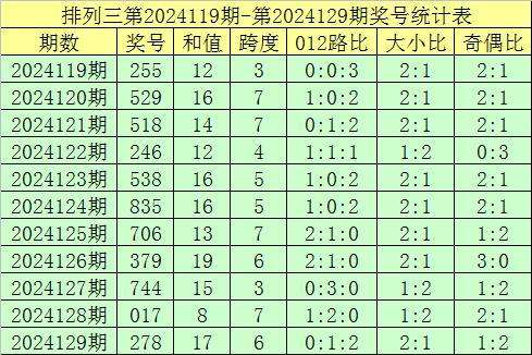 开奖回顾:排列三第2024129期奖号开出:278,组选类型:组六,大小比为2:1,奇偶比为1:2,和值为17,跨度为6。