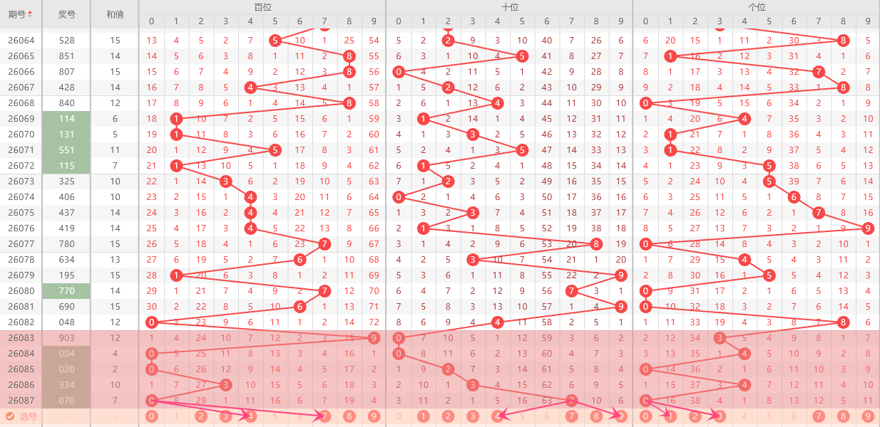 十位上期开出号码7,大数、奇数、十位近5期开出号码为:0-0-2-3-7,从近5期看83期遗漏为8,84期遗漏为0,85期遗漏为11,86期遗漏为7,87期遗漏为6,本期号码关注遗漏号码4、9,大小走势为:小小小小大。小数走热开出,本期关注大数开出。奇偶走势为:偶偶偶奇奇,偶数形态走热,注意偶数开出。本期十位推荐:1-2-3-4-7-8-9