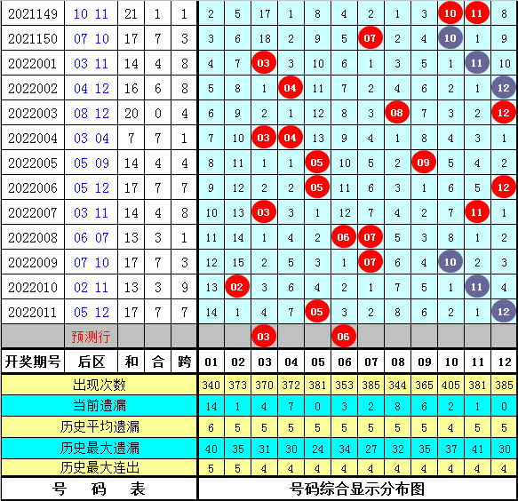 6、在第012期历史同期开奖中,后区奖号跨度分别开出:4-1-2-7-3-5-9-2-4-9-5-4-3-2-8,跨度范围在1-9之间,本期后区跨度参考3。