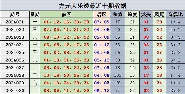 上期回顾,大乐透第2024030开奖,本期奖号:前区08 09 11 19 30;后区06 12,当期前区号码大小比为2:3,三区比3:1:1,奇偶比3:2。前区开出连号08 09,开出重号19。
