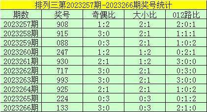 开奖回顾:排列三第2023266期奖号为:133,其奇偶比为3:0,大小比为0:3,奖号012路比为2:1:0。