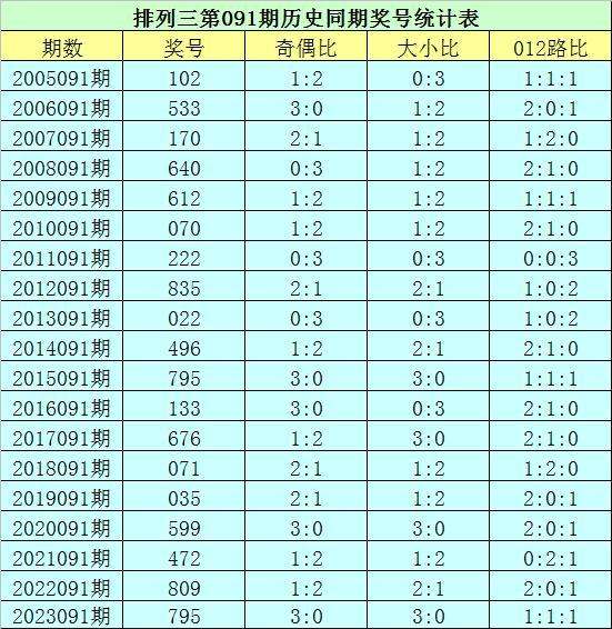 排列三第2024091期开奖日期:2024年4月10日,历史上第091期已开出了19次奖号,历年同期号码分别为:102、533、170、640、612、070、222、835、022、496、795、133、676、071、035、599、472、809、795。