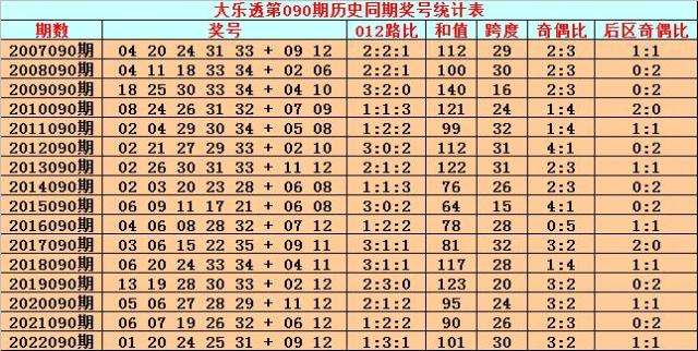 综上所述,大乐透第2023090期前区012路比参考2:2:1。