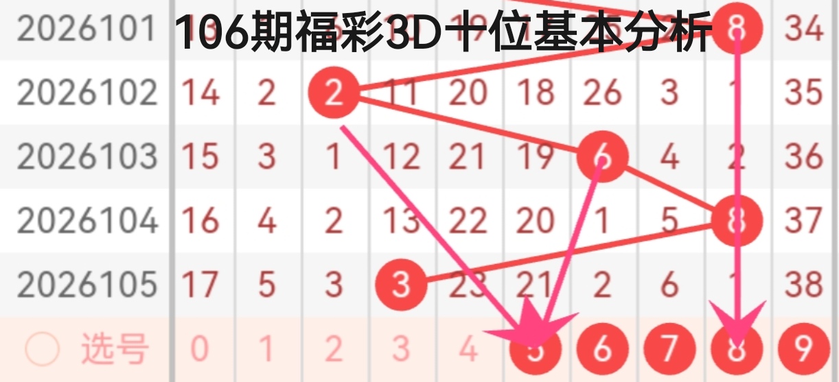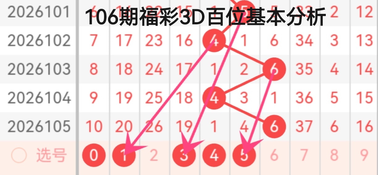 2026101-2026105期百位开奖数据分别为5、4、6、4、6,整体呈现出明显的波动与重复交替特征,偶数占比高达80%,奇数仅在101期出现一次,偶数强势主导趋势显著。其中4、6两个数字形成高频重复形态,102-105期两次开出4、两次开出6,形成“4-6-4-6”的对称循环走势,说明偶数段尤其是4、6所在的中偶数区活跃度极高。从走势连线的落点来看,箭头明确指向1、3、5三个数字,结合近期奇数回补的潜在需求,这三个数字具备较强的出号潜力。其中1作为小号奇数,打破了近期百位大号偶数的垄断格局,3作为中号奇数可衔接奇偶交替节奏,5作为前期出现过的数字,延续了奇偶交替的可能性。综合来看,百位重点关注1、3、5,防偶数回补的0、4。