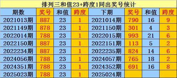 上期回顾:排列三第2025023期奖号:788。和值23,跨度1。