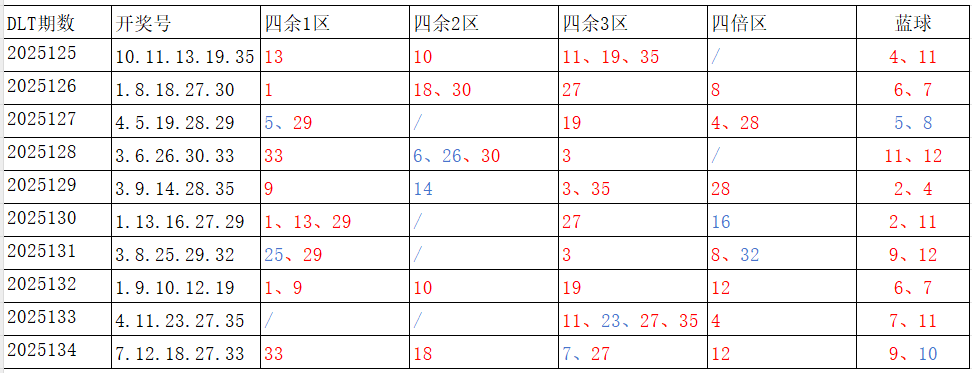 分享第一个数据分析:四分区统计数据。相对于传统的三分区,个人习惯使用四分区,就是把35个红球号码除以4,所得的余数分区如下:
