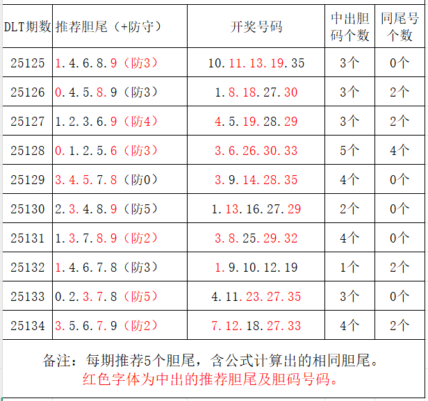 如图,每期推荐胆尾中出1-4个。上期推荐胆尾中出3尾4码!推荐胆尾是按照公式计算的顺序,不定位红球号码的顺序。本期推荐胆尾:9尾/6尾/3尾/2尾/0尾,加推防守胆尾+胆码号码:***(会员专区可见)。个人分析,仅供参考。