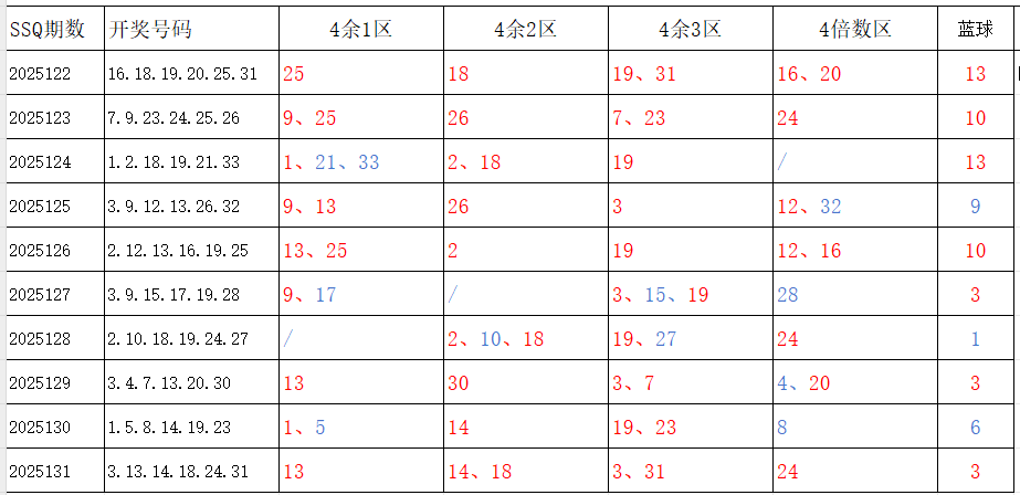分享第一个数据分析:四分区统计数据。相对于传统的三分区,个人习惯使用四分区,就是把33个红球号码除以4,所得的余数分区如下: