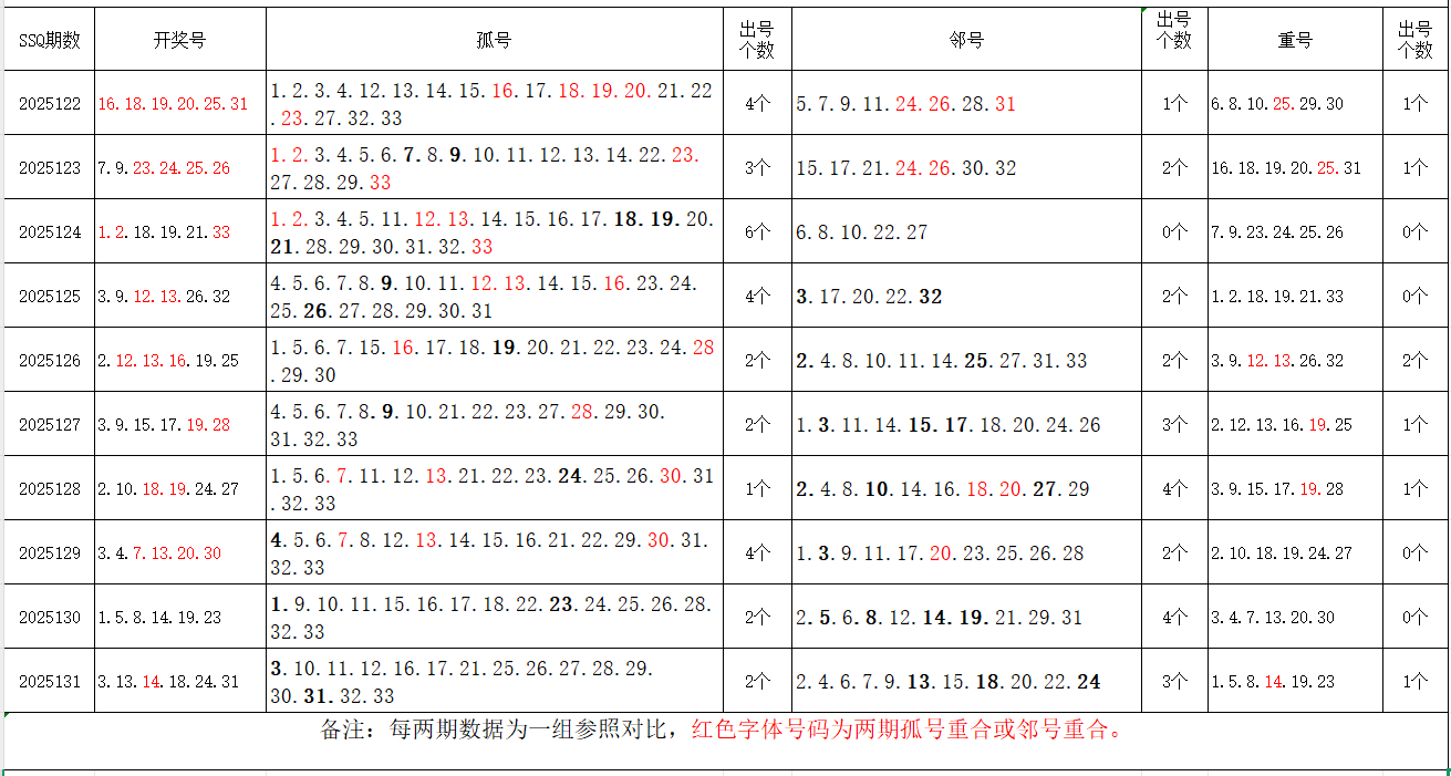 如图,以近两期数据为一组,进行对比分析。相同的孤号、邻号,可能在下期出1-4个左右。上期开出孤号2个,邻号3个,重号1个。本期参考孤号:1.5.6.7.8.9.10.11.16.20.21.22.26.27.28.29.33;邻号:2.4.12.15.17.19.23.25.30.32;孤、邻号重合号码精选:***(会员专区可见)。个人分析,仅供参考。