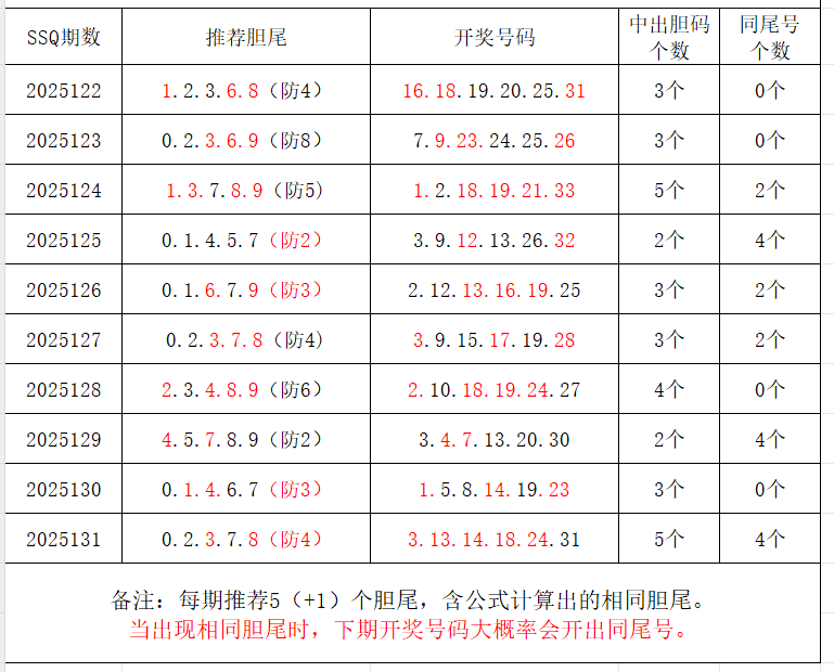 如图,每期推荐胆尾中出1-4个。上期推荐胆尾中出3尾5码!推荐胆尾是按照公式计算的顺序,不定位红球号码的顺序。本期推荐胆尾:7尾/4尾/9尾/2尾/1尾 。加推重点胆尾:***(会员专区可见)。推荐胆码号码:***(会员专区可见)。个人分析,仅供参考。