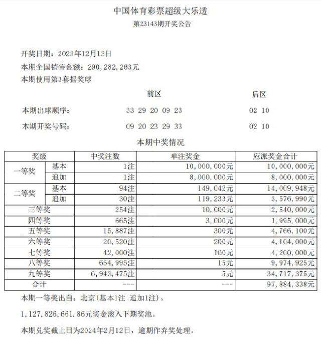 北京时间12月13日晚,体彩大乐透第23143期开奖,当期开奖号码为前区09 20 23 29 33,后区02 10。
