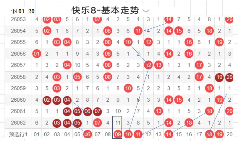 上期开奖数据解析,区间比6356,重码4个,5期以下开出不含重码14个,冷码开出1个,10期以上.尾数集中8尾,其他尾比例平均,奇偶比的区间很稳定.5期以下加重码达14个数,重点选码在5期以下,选码方式做出调整.以区间比,重码,尾数比,走势图为主要条件选码,先做出粗选,再总结.以此为据,推测063期.