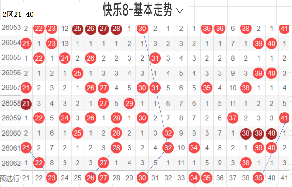 二区(21-40):遗漏5期以下有17个,0码22 27 38 3个,数据所示,冷码平均,选择条件增多了.上期开出了3个号码,出码比较集中.这期布防相应增加,重码按比例落这区较少,先给出关联码23,这个区间间接走势,温区,21-30区间上期开了2个,依旧不是重点选号区间,31-40区间开出1个,本期关注热码的回补,间隔小遗漏值最佳,3字头转热,这个小区热码注意回调,可以做关联码的布局,注重温冷码的回补.