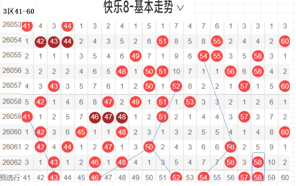 三区(41-60):遗漏5期以下有17码,0码43 46 48 56 58 5个,温开方式,这区码数有回暖之意,可以防一手,先定胆码走势较大者,隔期,斜三连,分边号码,可重防,间隔5期以上号码可以随走势选取,例如本期大冷码,走势比较大,可以做胆,通常联动可带出,分边对称的号码,本区间也有很大走势.可关注下.隐形夹角号码.做补位形态号码.都需要观察动态走势.以上是本区间的选码方法.
