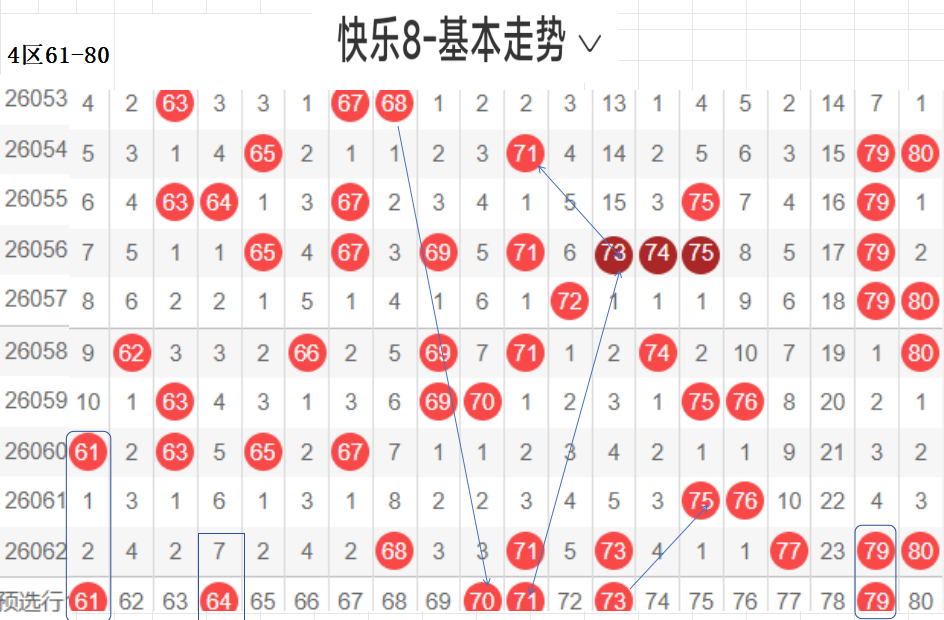 四区:(61-80):遗漏5期(含5)以下有18码,0码68 71 73 77 79 80 6个,平均温开方式,上期开出6码,区间回暖,后区可防,四区间从以往数据来看,重码很强,一枝独秀的存在,近期有回补走热的趋势,区间回暖后,本区间后区可防,与一区相比,也是温区.,对称下落码,隔期回补码,可以防守,这区对呈对称三角关系的胆码,斜三连有走势的胆码,联动落位码,都有各自的走向落位关系,根据走势选择一种方式选码.