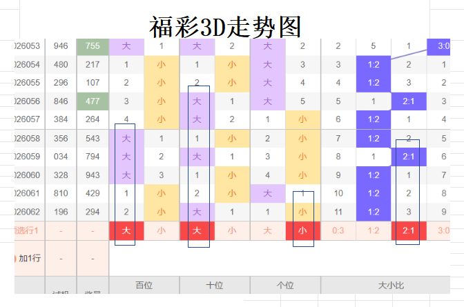 2:如图所示,上期1大2小走势.个位的走势出1小,十位出1大,百位出2小.比例为1:2.本期给出的推测是2大1小.个位小码:01234.十位大码:56789,百位大码:56789.这是给出的范围.下面通过其他走势缩小范围.