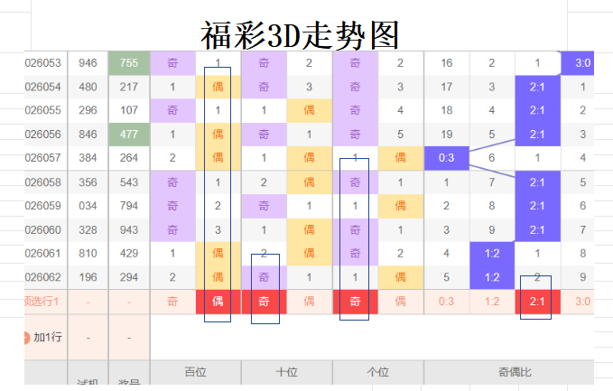 3:如图所示数据,上期开出1奇2偶,个位为偶,开1期.十位为奇,开1期.百位为偶,开2期.比例1:2.本期推测2奇1偶,个位为奇,13579.十位为奇,13579,百位为偶,02468.结合下大小分析进行缩小