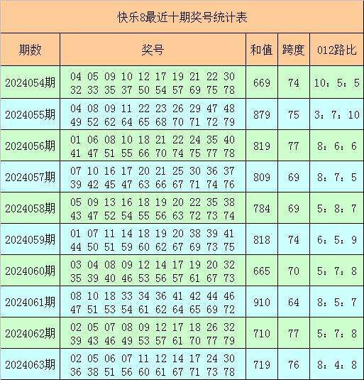 快乐8第2024063期奖号为:02 05 06 07 11 12 14 17 24 30 36 38 51 56 60 61 67 71 73 78,其中奖号012路比为8:4:8,和值为719,跨度为76。