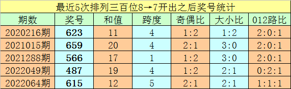 跨度判断:连续10期跨度开出012路比为4:3:3,012路跨度基本持平,跨度最近3期遗漏值分别为2期、23期和3期,本期预计跨度遗漏值走大,防温冷跨度解冻,参考跨度8。
