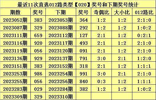 排列三上期开出奖号为:329,其直选012路类型为020,历史上直选020号码已开出了322次,最近11期分别开出奖号为:383、329、659、920、056、929、383、986、056、029、329。