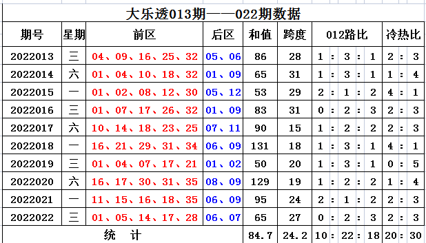 上期回顾,大乐透第2022022期开奖,本期奖号:前区01 05 14 17 28;后区06 07,当期前区号码大小比为1:4,三区比2:2:1,奇偶比为3:2。前区未开出连号,未开出重号。