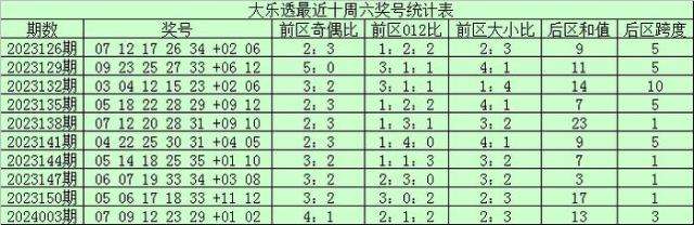 前区奇偶走势:上期前区奇偶比为4:1,上周六前区奇偶比4:1,最近十周六奇数号码表现占优,本期看好奇数号码继续走热,推荐奇偶比3:2。