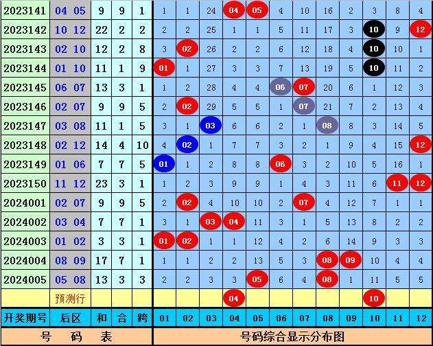 后区分析:上期后区奖号为05+08,开出一大一小组合,上周六后区奖号开出01+02,最近十周六后区奖号大小比为9:11,大小号码走势基本相当,本周六看好大小号码继续平衡,关注两码04、10。