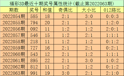 开奖回顾:第2022063期福彩3D奖号为991。奖号形态为组三,大小比为2:1,和值为19,奇偶比为3:0,012路比为2:1:0,跨度为8。