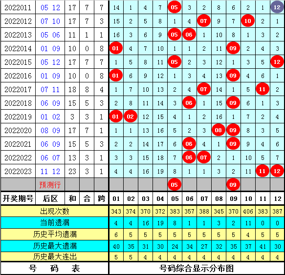 后区上期开出奖号:11+12,前6次后区奖号11+12出现之后,其下期分别开出号码:02+12、04+05、05+12、01+05、08+09、04+08,本期后区注意五码03 05 09 10,单挑两码05 09。