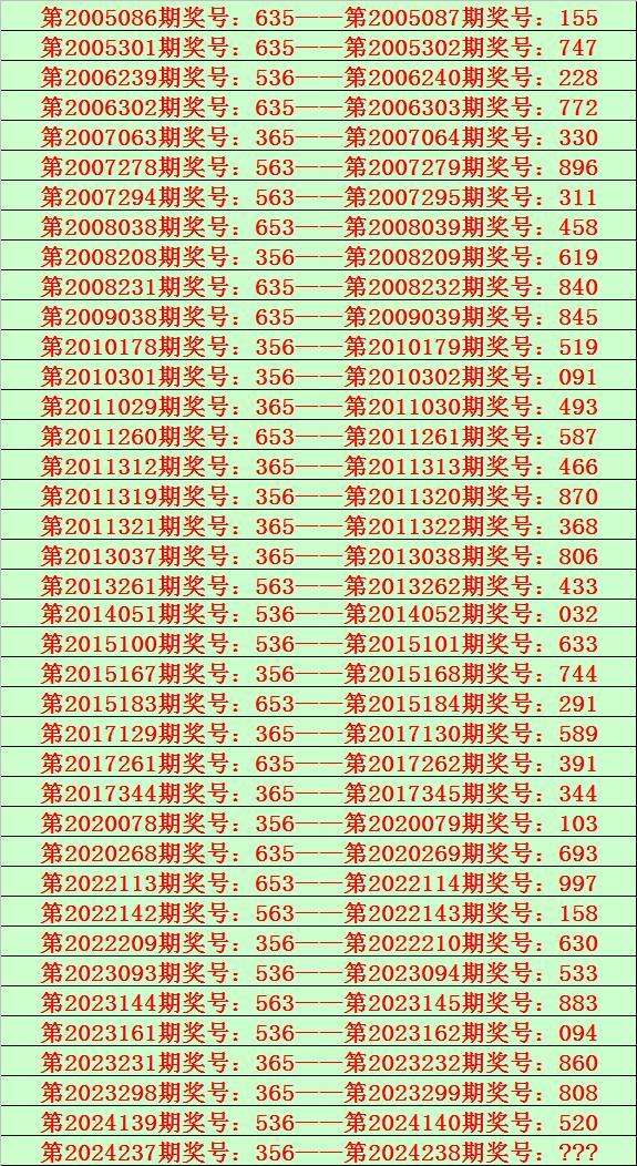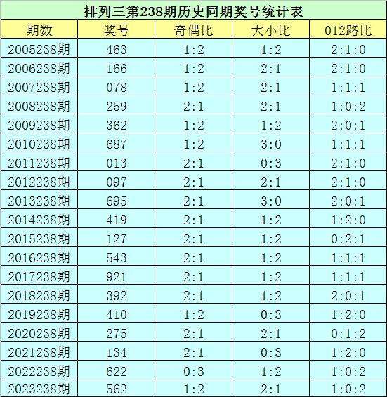 排列三第2024238期开奖日期:2024年9月4日,历史上第238期已开出了19次奖号,历年同期号码分别为:463、166、078、259、362、687、013、097、695、419、127、543、921、392、410、275、134、622、562。