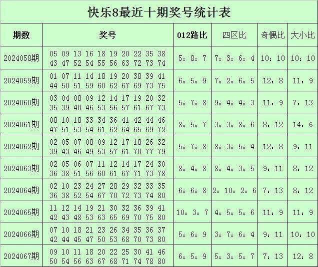 福彩快乐8第2024067期开奖回顾:09 10 11 18 20 22 25 30 41 46 50 54 56 63 67 68 71 74 78 80,其中奖号012路比为6:5:9,四区比为5:3:5:7,奇偶比为7:13,大小比为12:8。