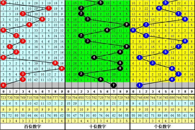 组选分析:在0-9的组选分布图中,最近10期0-2区段开出10个号码,3-6区段开出11个号码,7-9区段开出9个号码,上期奖号全部分布在3-6之间,本期预计号码主要在两端热出,防3-6区段走冷。