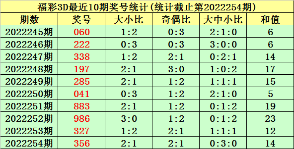 开奖回顾:福彩3D第2022254期奖号为:356。奖号类型为组六,和值为14,奇偶比为2:1,跨度为3,012路比为2:0:1,大小比为2:1。